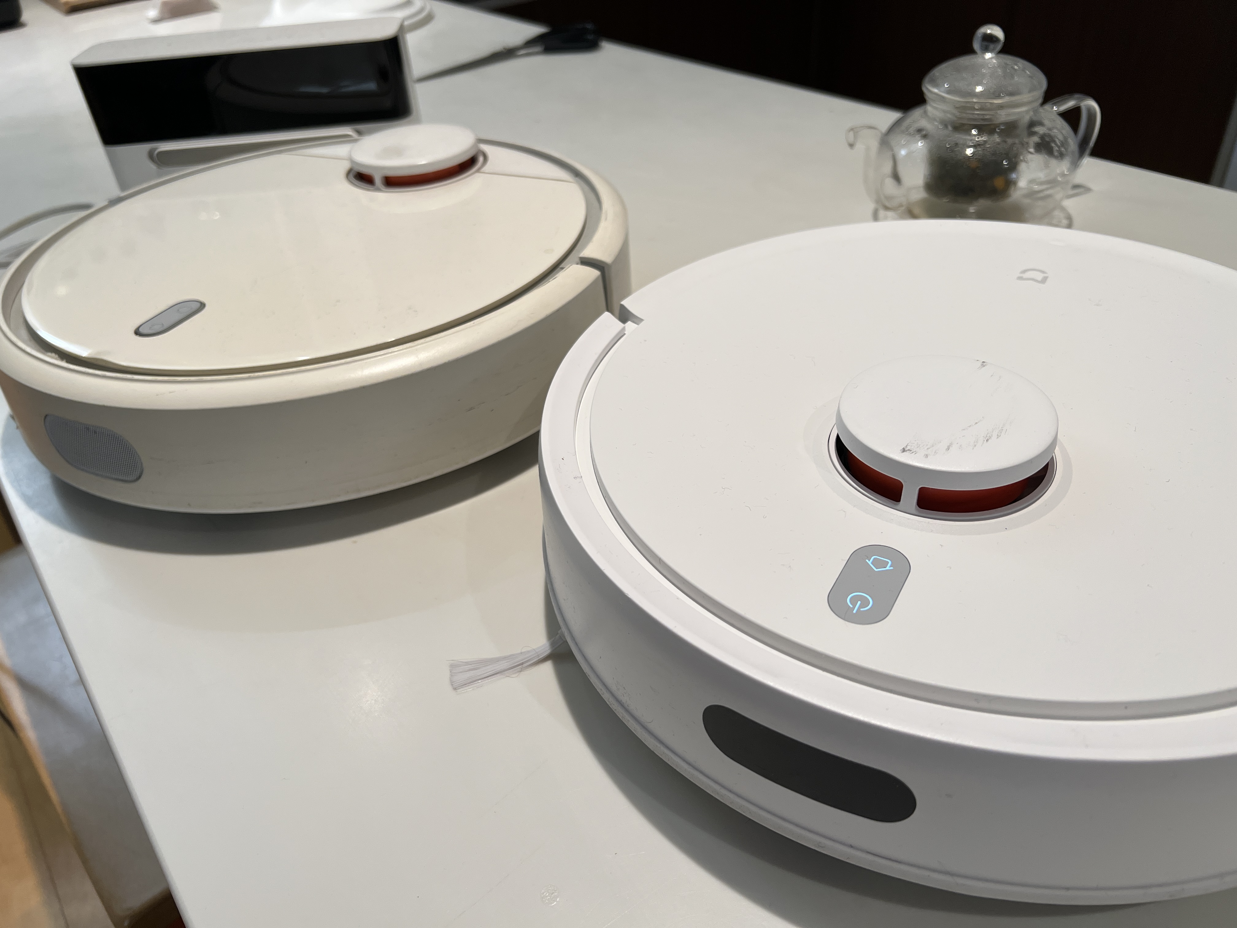 왼쪽에 있는 게 2016년부터 사용한 제품인데, 뭐 이때나 지금이나 로봇청소기 디자인에서는 크게 달라진 건 없는데, 확실히 이번에 구매한 신형 제품이 좀 더 깔끔하고 견고한 느낌이 든다.