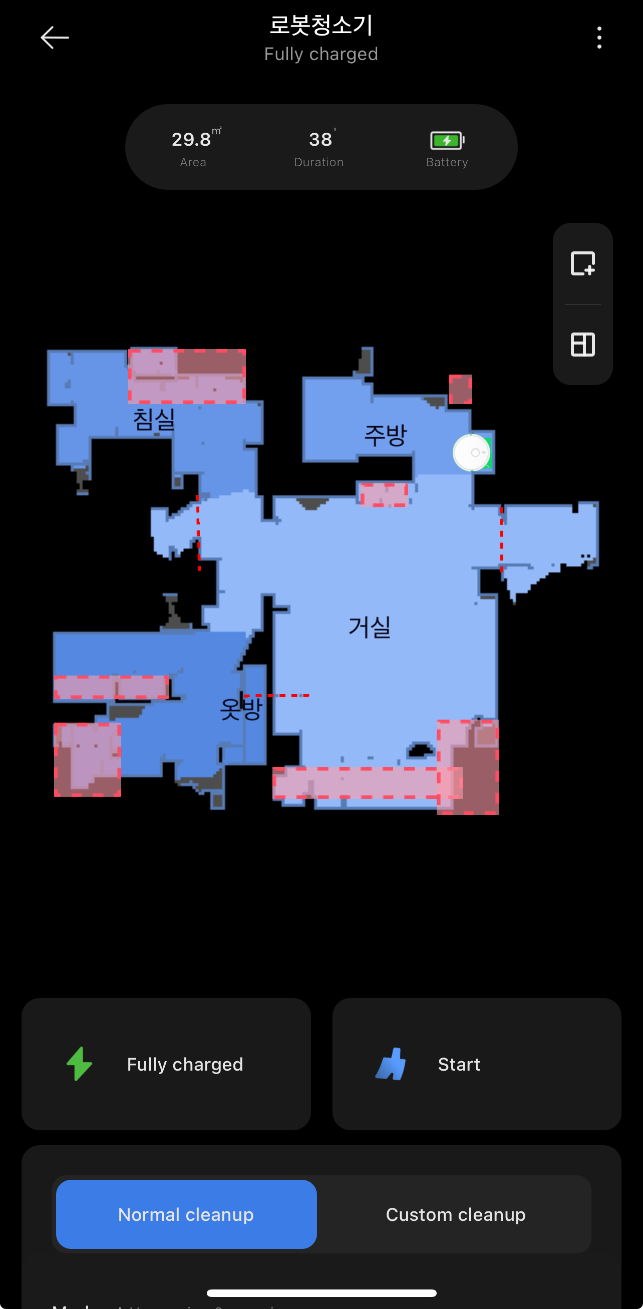 저 빨간색으로 표시한 부분은 청소 금지 구역인데 저렇게 가상으로 금지 구역을 설정해두면 알아서 그쪽 공간은 피해 간다.