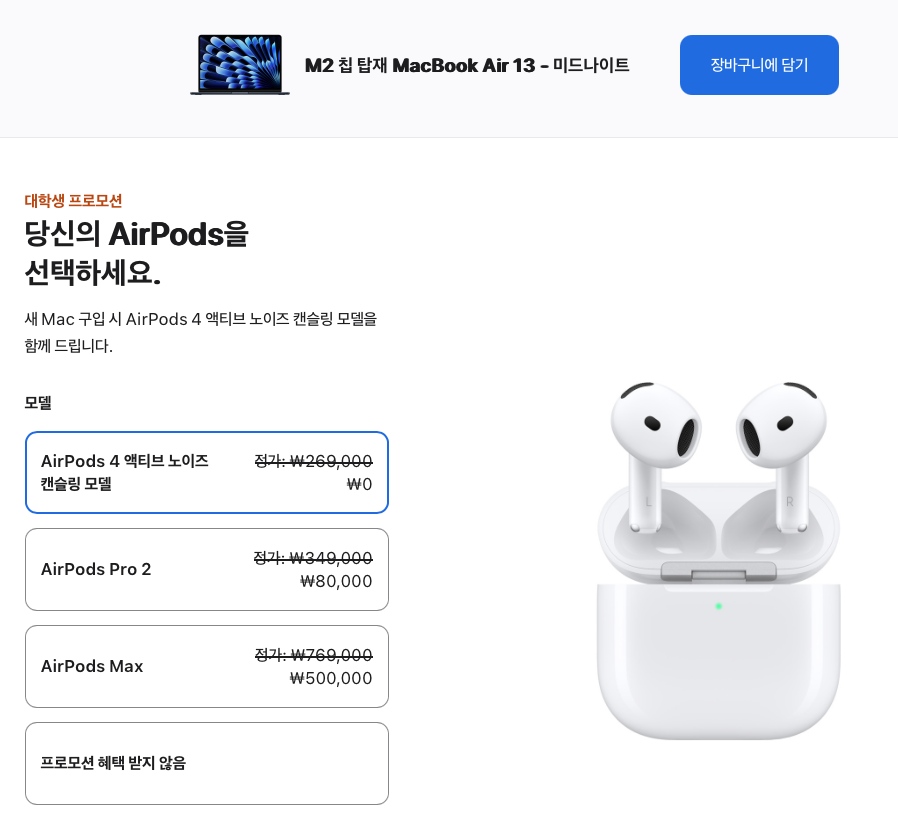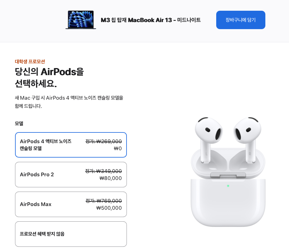 우선 맥북 라인업은 에어팟을 제공한다. 맥북에어 13인치 m2모델은 124만원에 구매할 수 있고, 여기에 에어팟4 노이즈캔슬링 모델은 무료, 에어팟 프로2로 업그레이드 하기 위해서는 8만원 추가, 에어팟 프로 맥스로 업그레이드 하기 위해서는 50만원을 추가해야 한다.