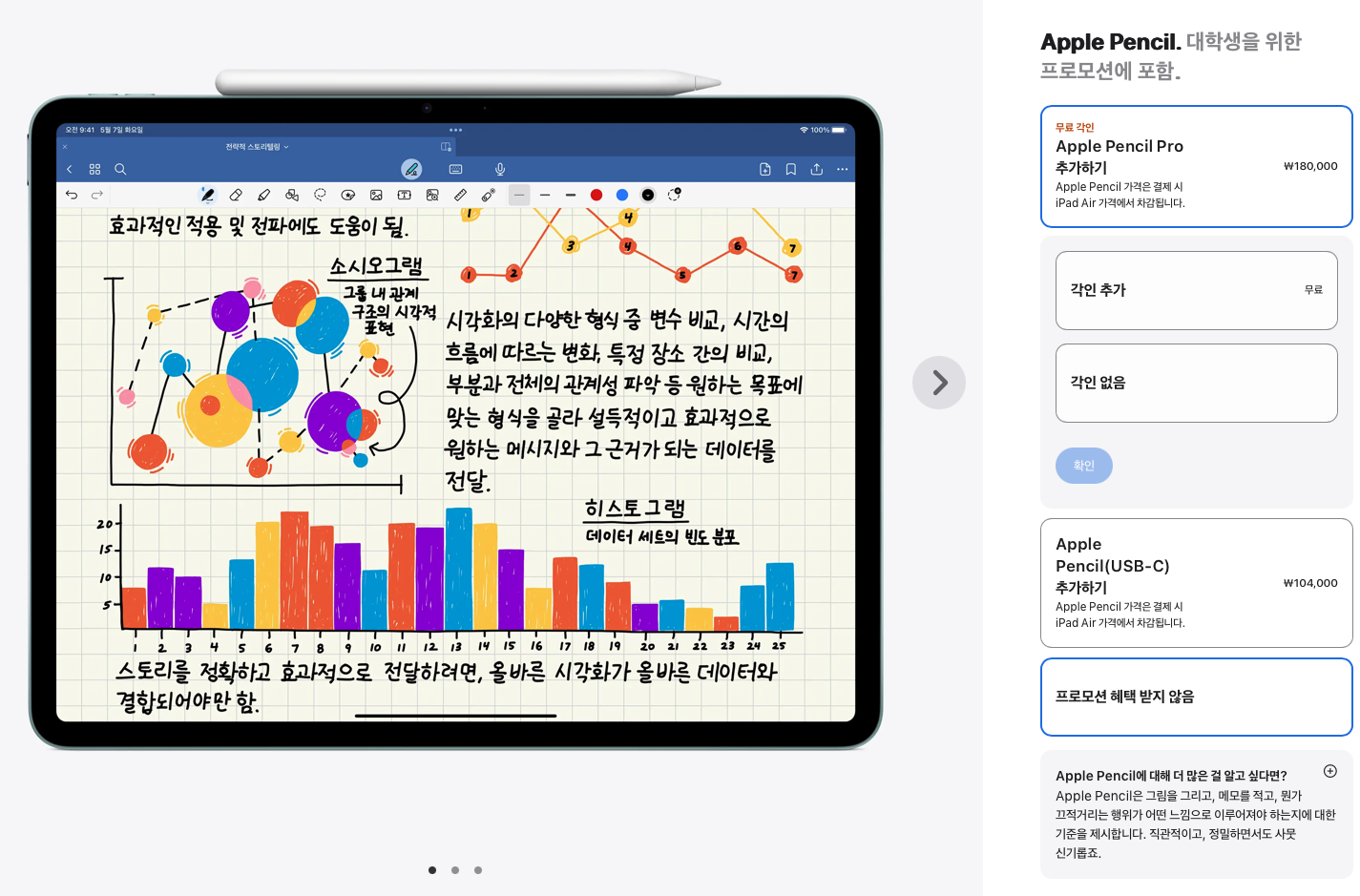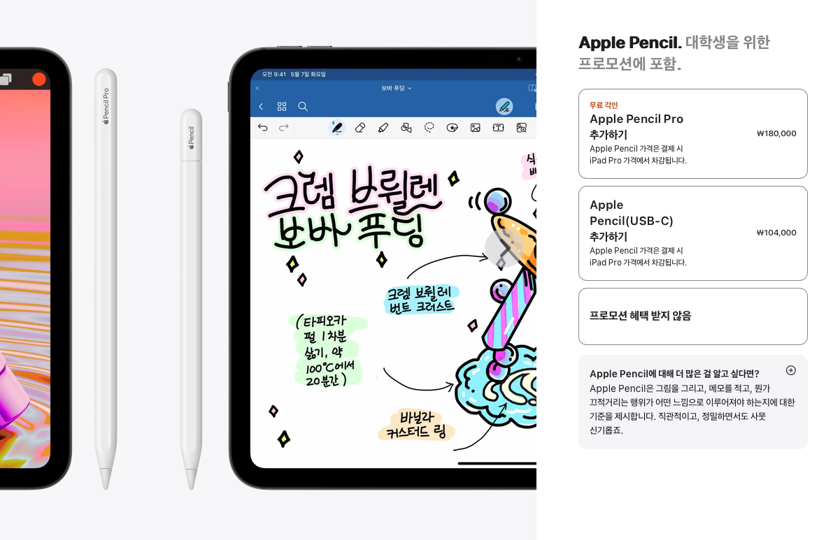 여기에 펜슬은 애플펜슬 프로를 구매하기 위해서는 18만원 추가, 애플펜슬 usb-c 모델은 104,000원을 추가해야 하는데 이 가격이 빠진다.