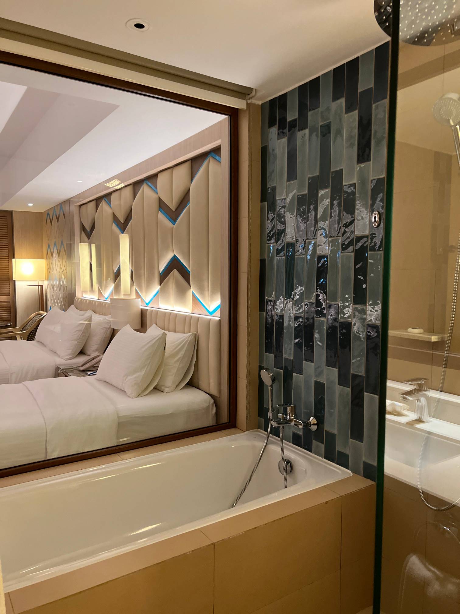 이런 식으로 욕실이 있는데 욕실이 투명 유리로 되어 있어서 침실에서 보인다.