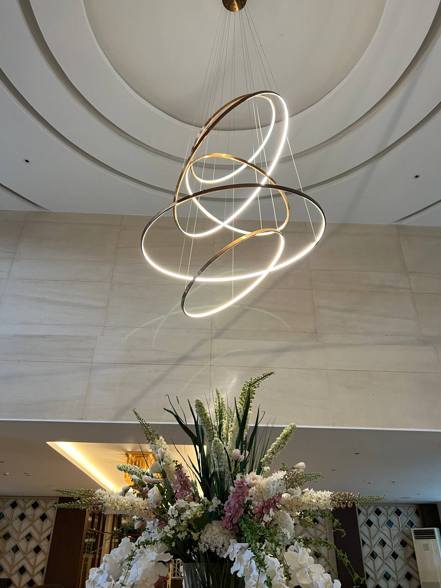 가운데에 큰 화분 같은 게 있고 천장에 샹들리에가 있는데 매우 고급스럽고 예쁘다.