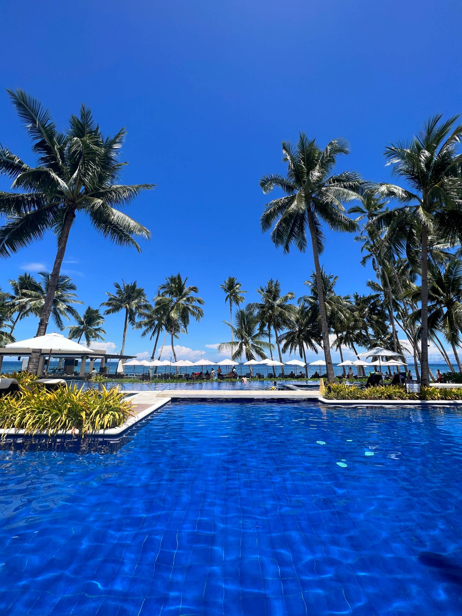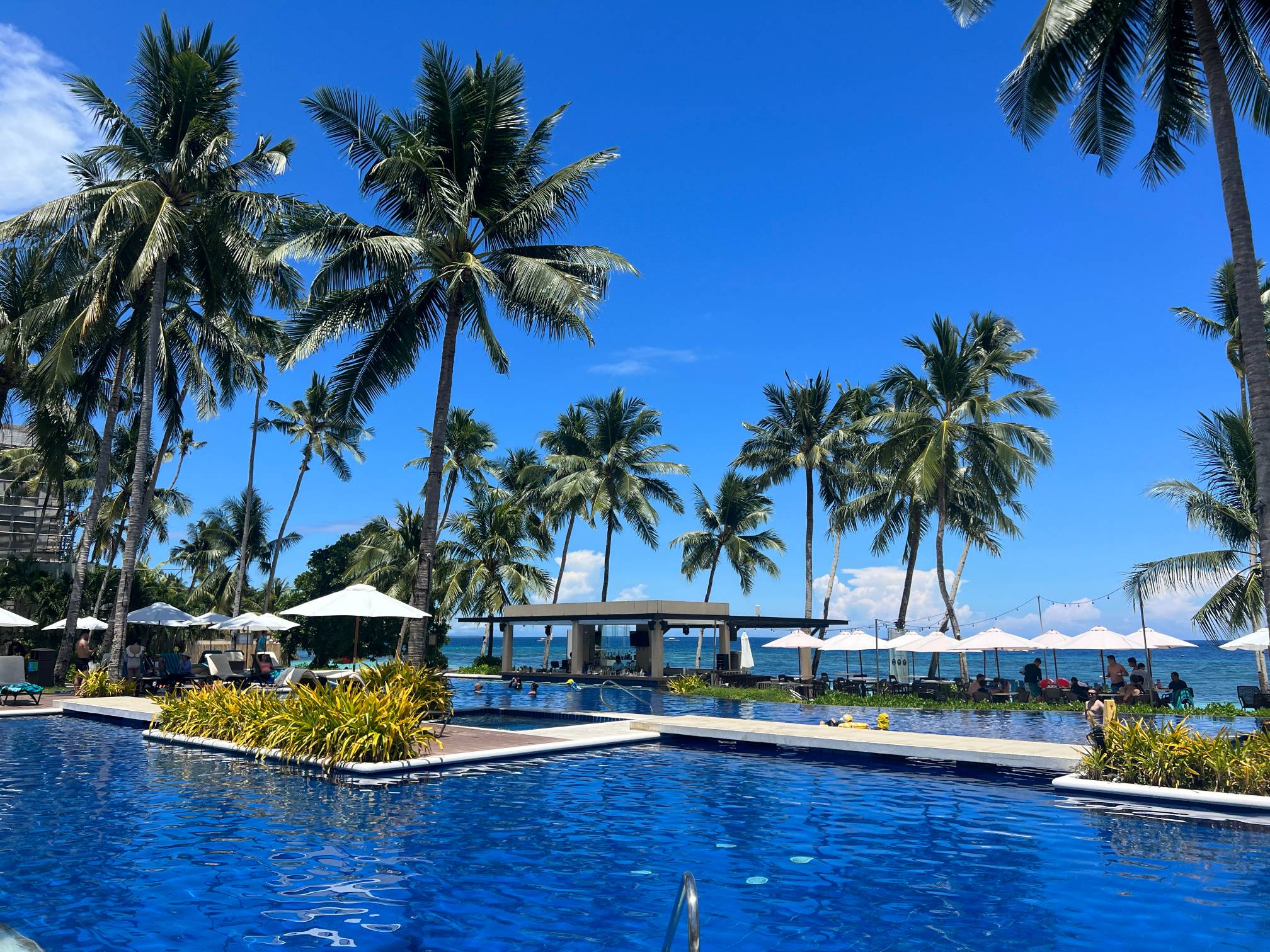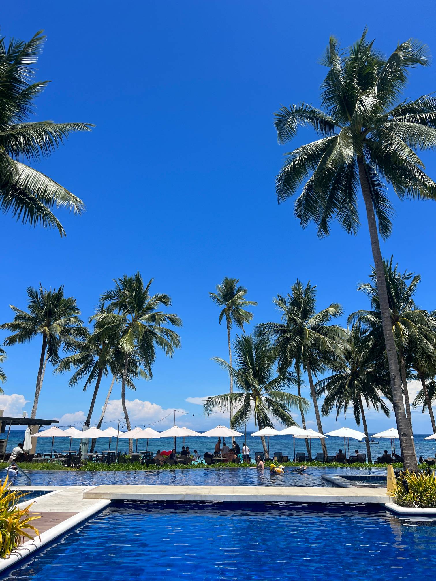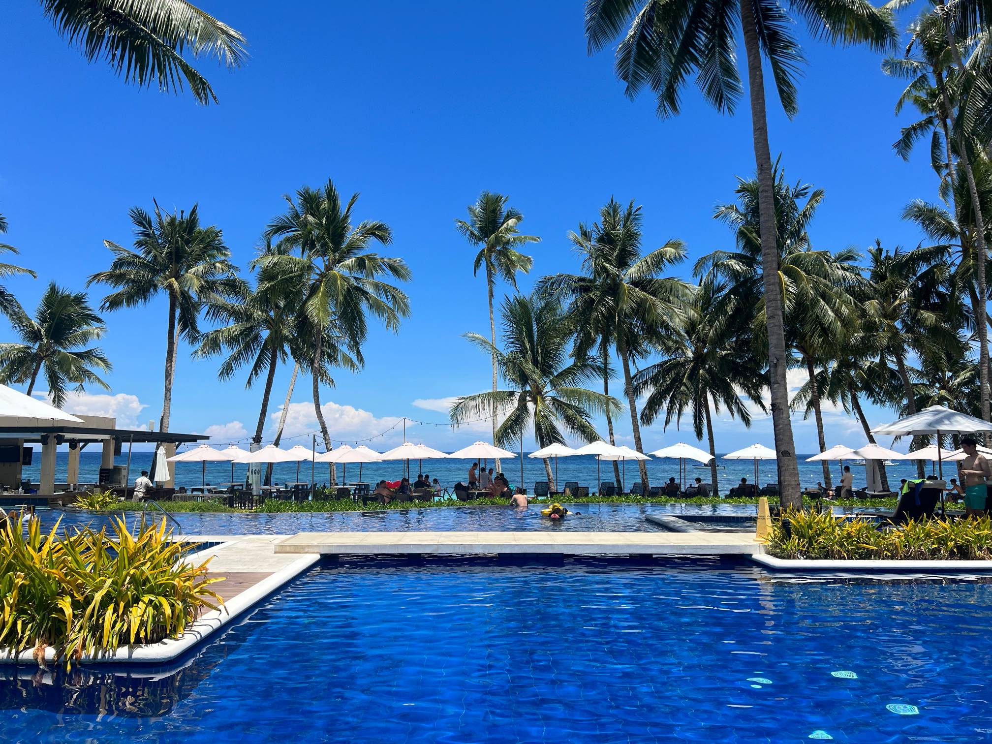 파란 수영장 색과 야자나무, 그리고 바로 앞에 보이는 해변의 풍경이 진짜 환상적일 정도로 아름답다.