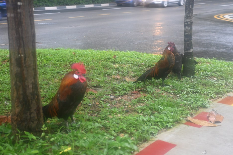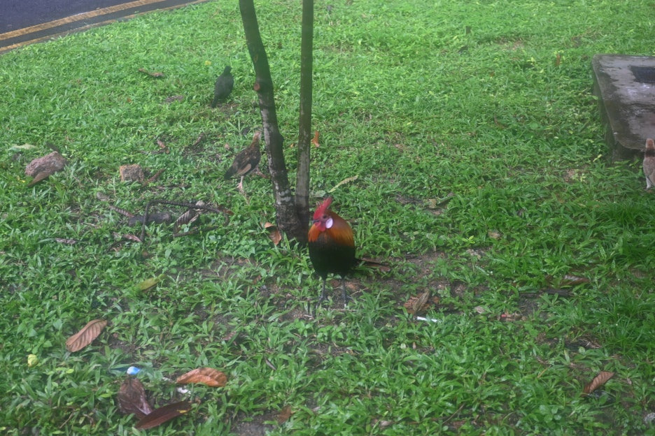 비가 조금 내리고 있는데 닭들이 밖에서 산책을 하고 있다.