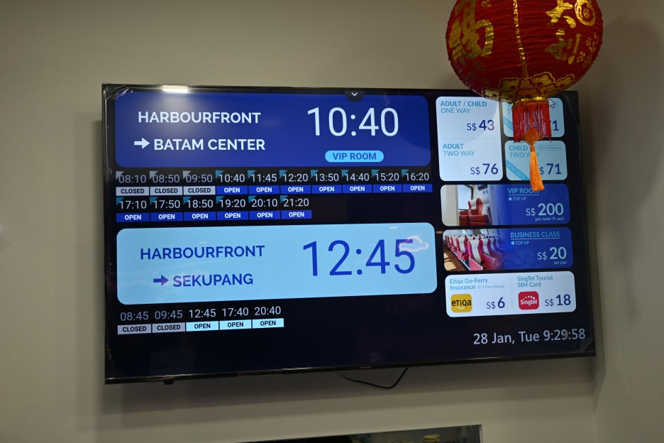 여기에 가면 여러 페리 업체들이 있는데 ’마제스틱패스트 페리‘라는 회사가 배도 좋고 깔끔하다고 해서 클룩에서 미리 예매했다. 참고로 아무리 가까워서도 비행기 타듯이 짐도 맡겨야 하고 출국심사도 해야 하니 배 시간 1시간 전에는 도착해야 한다. 나는 왕복 페리 가격은 약 7만원, 싱가폴에서 바탐으로 넘어가면 시차가 1시간이 생겨서 내가 10시 40분에 출발했는데 도착하니 10시 30분이었다.
