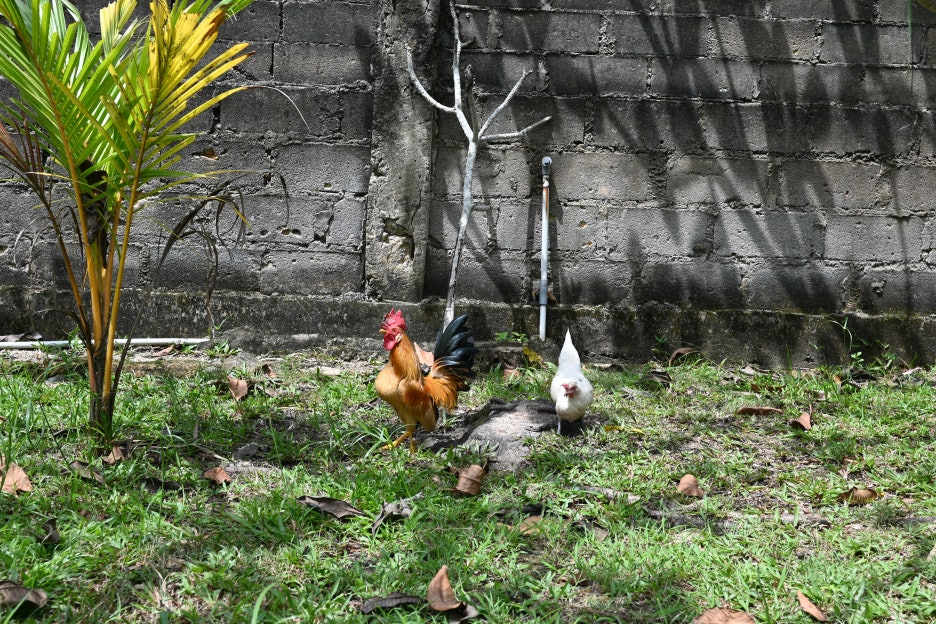 닭들이 마당에서 놀고 있다.