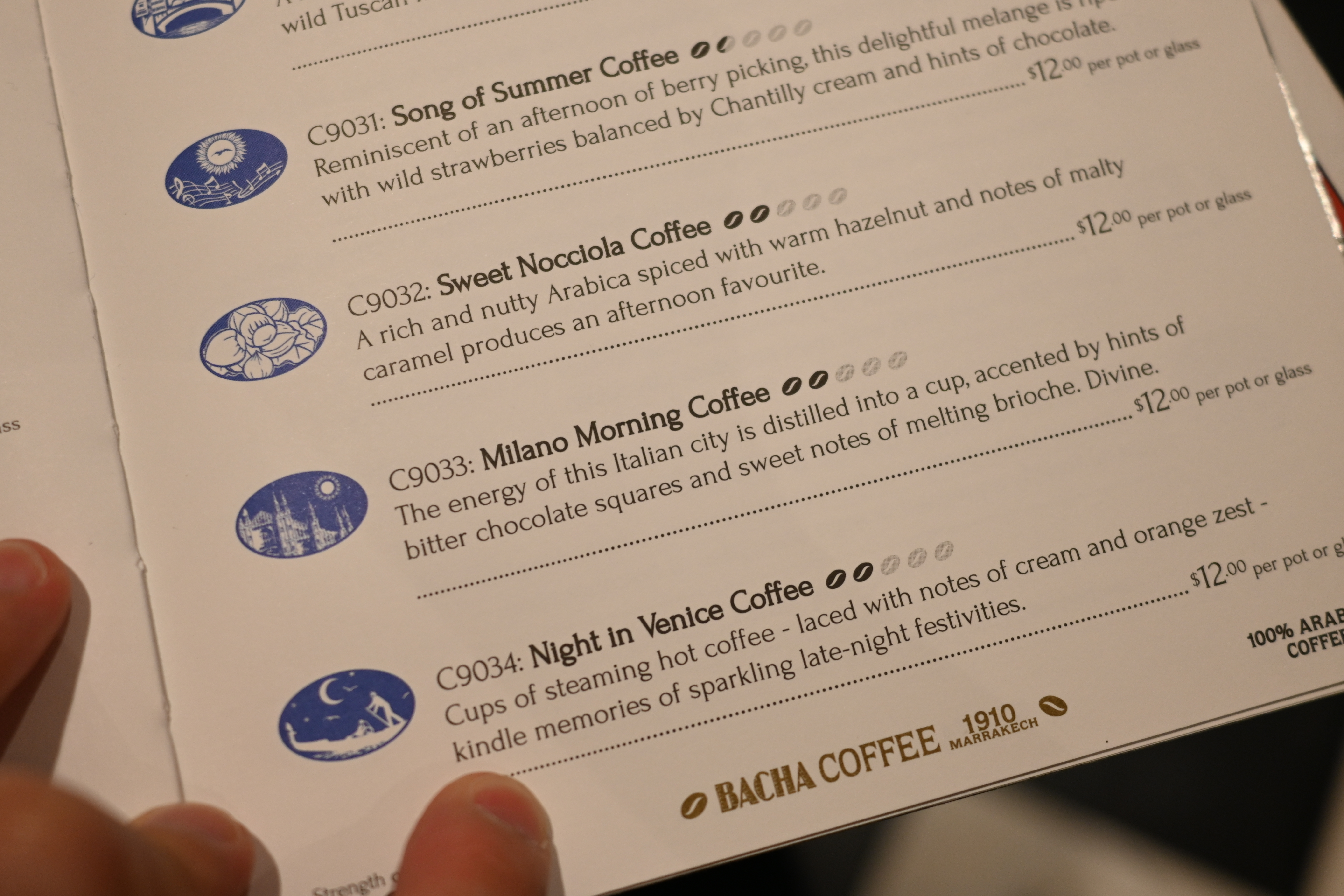 뭐 여기는 솔직히 마케팅으로 성공한 곳이기는 한데 하여튼 그런 모로코 스타일의 이국적인 느낌을 잘 만들어뒀다. 커피에 크로와상 두개 정도 시켜 먹으면 딱인 것 같은데, 매장도 고급스럽고 서비스 해주시는 분도 전문성이 느껴져서 만족스럽다. 커피 따라주시면서 ‘인조이~’ 하면서 웃고 가시는데 탈아시아 감성이다. 가격은 한 주전자에 약 12달러 정도.