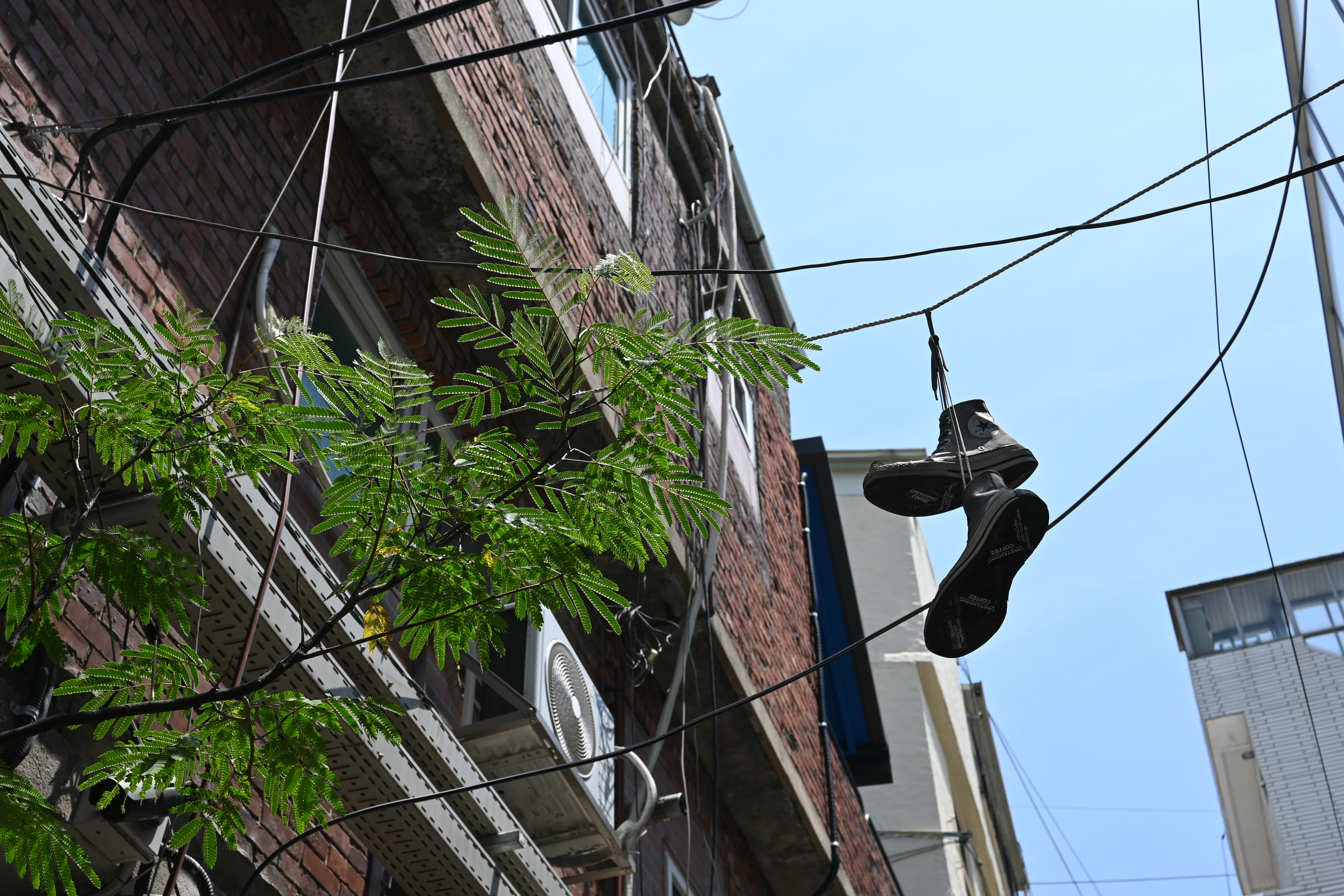 전깃줄에 웬 신발이 걸려있다. 성수동 감성?