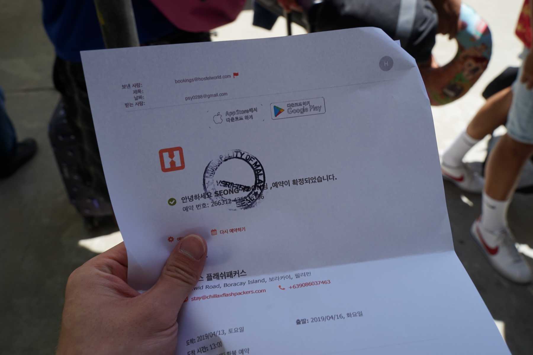 참고로 보라카이 섬에 들어가기 위해서는 인증받은 숙소 예약 내역서가 꼭 필요합니다. 이게 없으면 들어갈 수가 없어요. 혹시나 해서 프린트 해왔는데 다행이네요. 이거 모르시는 분들 많으실 것 같은데 정말 필수입니다.
