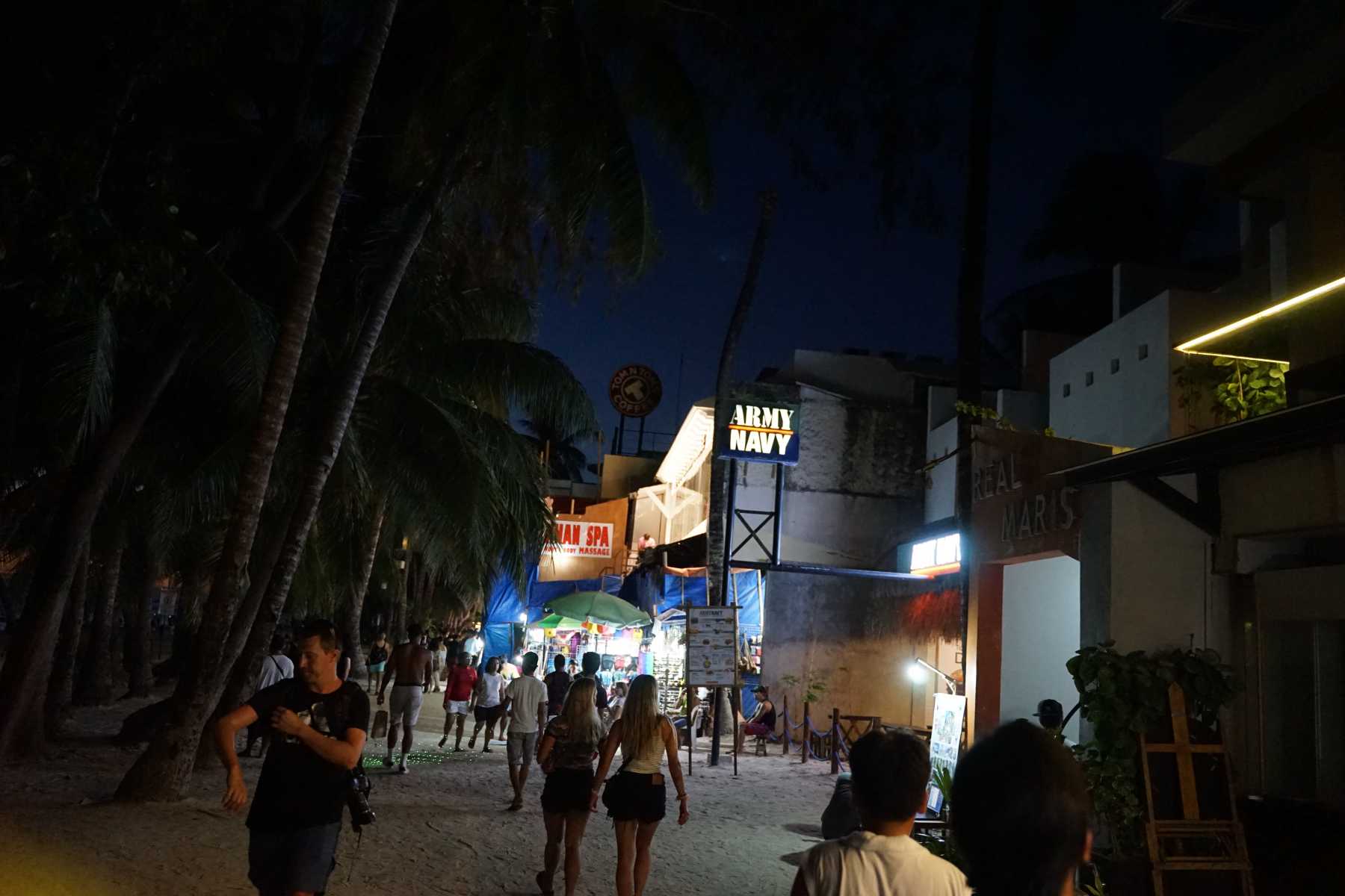 보라카이의 밤거리 모습. 이 해변가를 쭉 따라서 스테이션 1, 2, 3가 연결되는데 사람들이 이쪽으로 왔다 갔다 하면서 들어갈 만한 가게를 찾습니다.