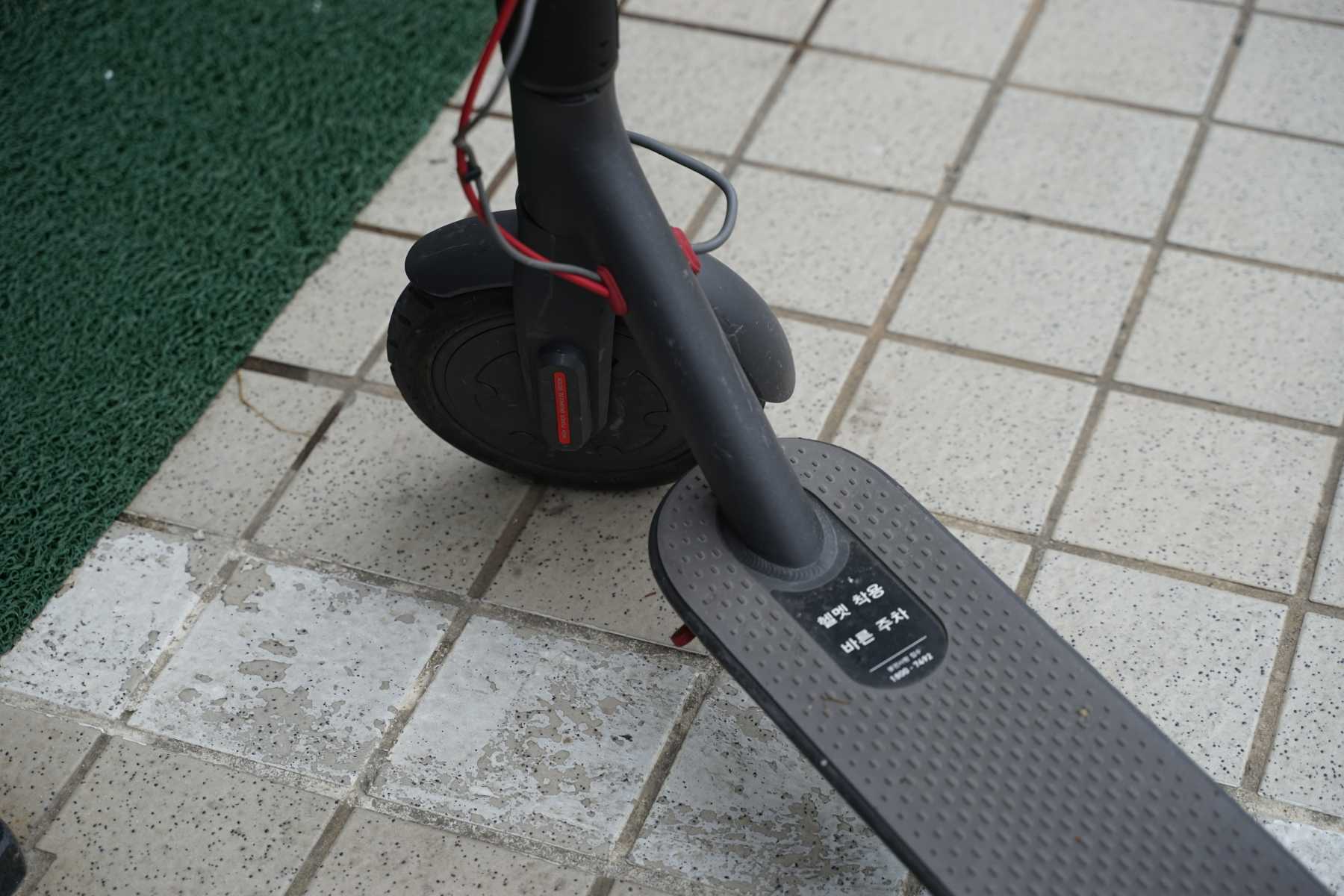 샤오미 전동킥보드는 발로 한번 굴러서 속력을 살짝 내둔 뒤에 손잡이 쪽에 있는 레버를 당기면 출발합니다.